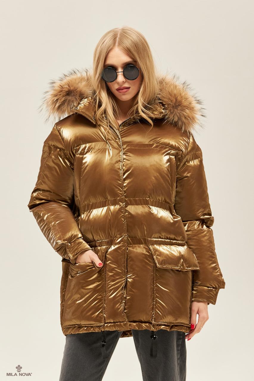 Зимовий пуховик з глянцевою водонепроникною плащової тканини з натуральним хутром єнота.
